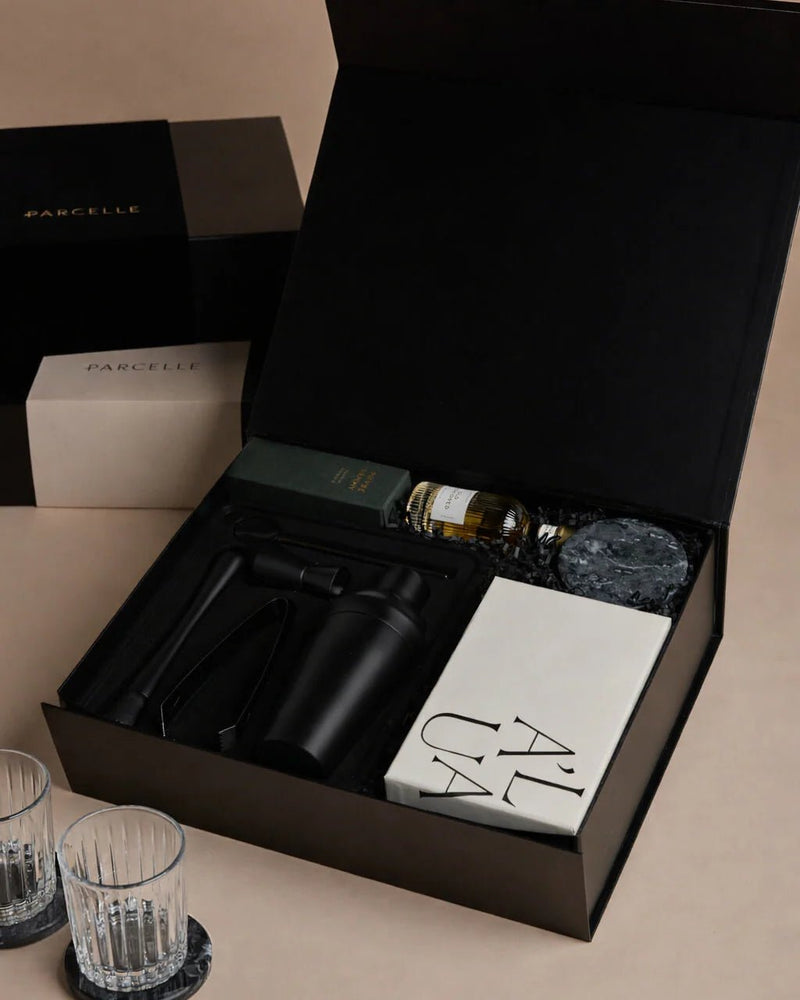 Featuring Sydney’s award-winning Maybe Sammy Old Fashioned Cocktail, paired with a sleek matte black cocktail set and fluted whiskey glassware, this curated hamper brings bar-quality style to the home or office. Thoughtfully presented in our Signature Parcelle Gift Box, it’s the perfect gift for settlement celebrations, team milestones, or that impossible-to-buy-for client.